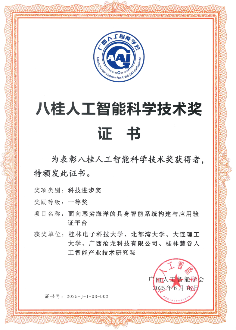 近日,2025年度八桂人工智能科学技术奖评选结果揭晓,我校作为主要完成单位申报的《面向恶劣海洋的具身智能系统构建与应用验证平台》项目荣获科技进步奖一等奖。该奖项由广西人工智能学会设立,是广西人工智能领域权威学术奖项,旨在表彰为技术革新与产业应用做出卓越贡献的科研集体。