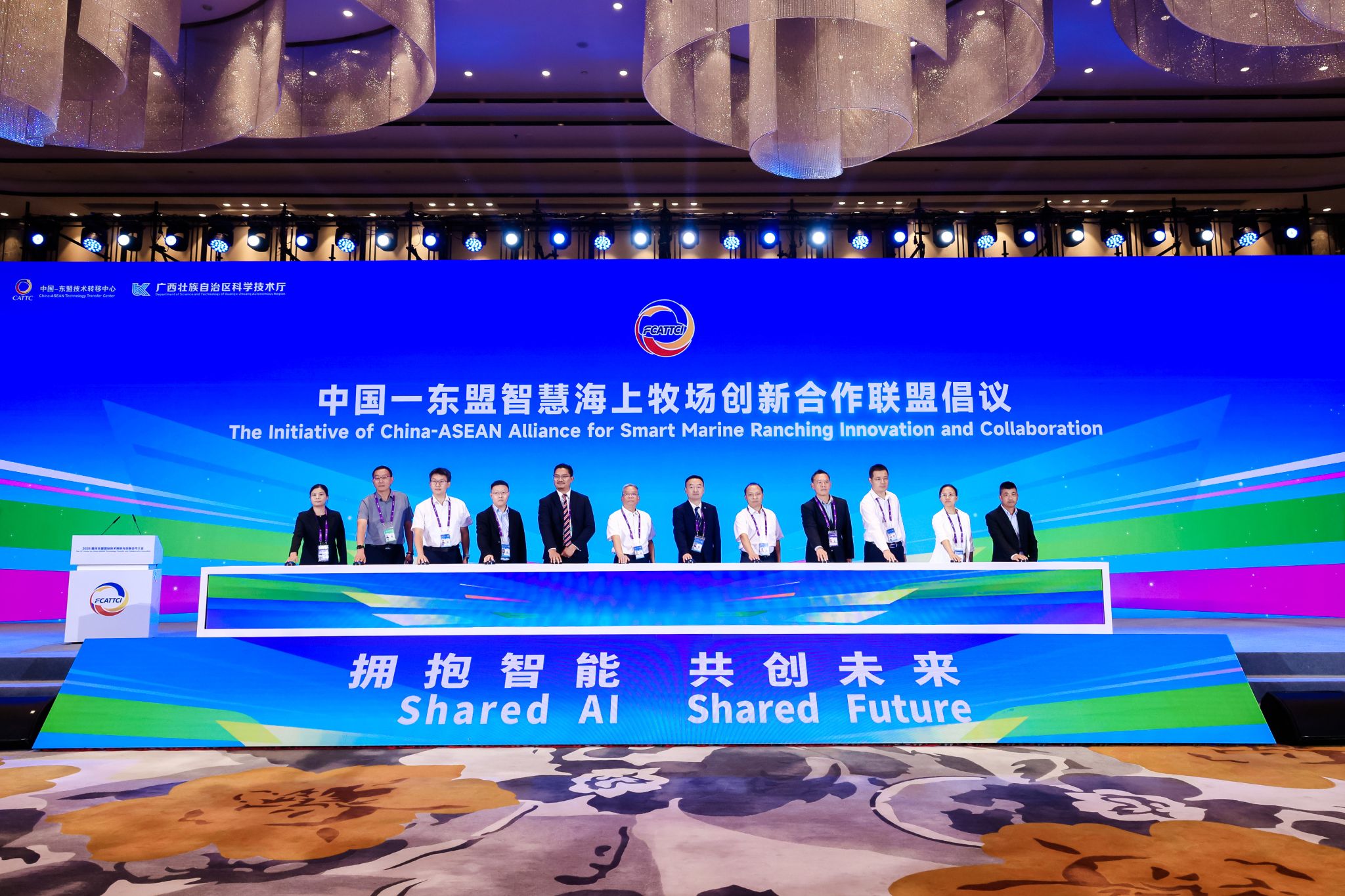 北部湾大学校长苗剑与广西科学院副院长吕郁彪,中国水产科学研究院海洋牧场技术重点实验室主任陈丕茂,文莱渔业养殖公司总经理Mohammad Nur Khalid bin Haji Ilias,泰国马尼特集团的总经理阿蒙·伦纳鲁米猜先生,马来西亚管理与科学大学代表陈健安博士,中国科学院海洋研究所研究员林承刚,中国科学院广州能源研究所主任、副研究员张亚群,中国海洋大学教授毕春伟,青岛森科特智能仪器有限公司副总经理刘成全,福建亚通新材料科技股份有限公司大区经理钟文坤,海世通渔业(文莱)有限公司项目主任韦丽芳等嘉宾一同登台,发布中国—东盟智慧海上牧场创新合作联盟倡议。