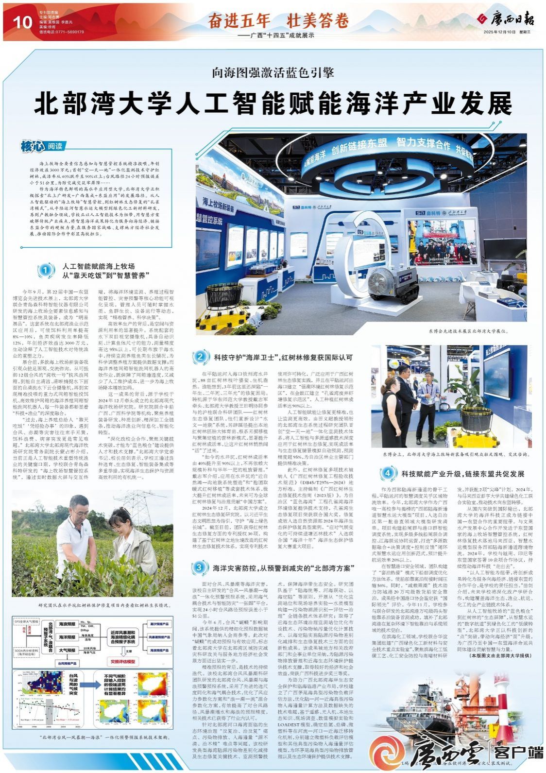 从人工智能牧场的“蓝色粮仓”到红树林的“生态屏障”,从智慧水运的“数字航道”到绿色化工的“低碳转型”,北部湾大学正以科技创新的“点”突破,带动向海经济“面”升级,为广西乃至中国—东盟海洋命运共同体建设贡献智慧与力量。