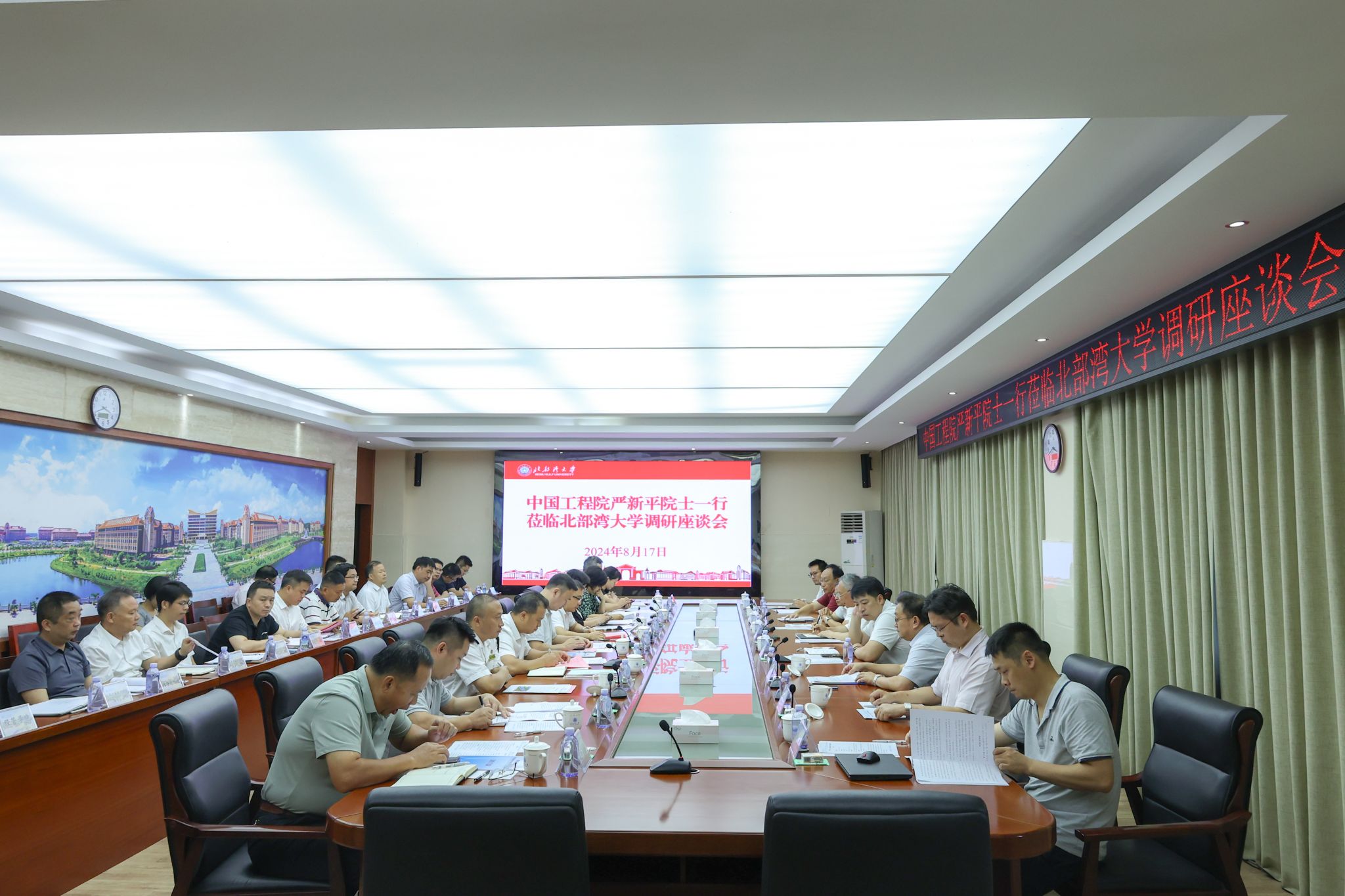 8月17日,中国工程院院士、武汉理工大学学术委员会主任、水路交通控制全国重点实验室主任严新平教授、武汉理工大学副校长张笛教授一行8人莅临我校就落实自治区党委书记刘宁在院士专家交流座谈会上提出的打造科技人才的大试验场、大实验基地、大研究室指示进行调研。此次调研聚焦于平陆运河航运系统与安全工程研究以及广西运河实验室建设等重要领域。校党委书记徐华蕊,校党委副书记、校长苗剑,钦州市人民政府副市长张红丹,校党委常委、副校长陈丹、闫松银等陪同调研。