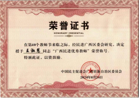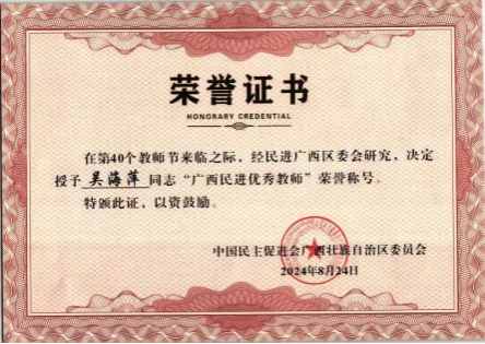 8月24日上午,民进广西区委会举行“广西民进优秀教师”荣誉称号颁授仪式,表彰160名广西民进优秀教师。民进广西区委会副主委罗真宣读了《民进广西区委会关于表彰“广西民进优秀教师”的决定》。我校民进会员、北部湾海洋发展研究中心研究员、经济管理学院教师王淑慧、海洋学院教师吴海萍荣获“广西民进优秀教师”荣誉称号。