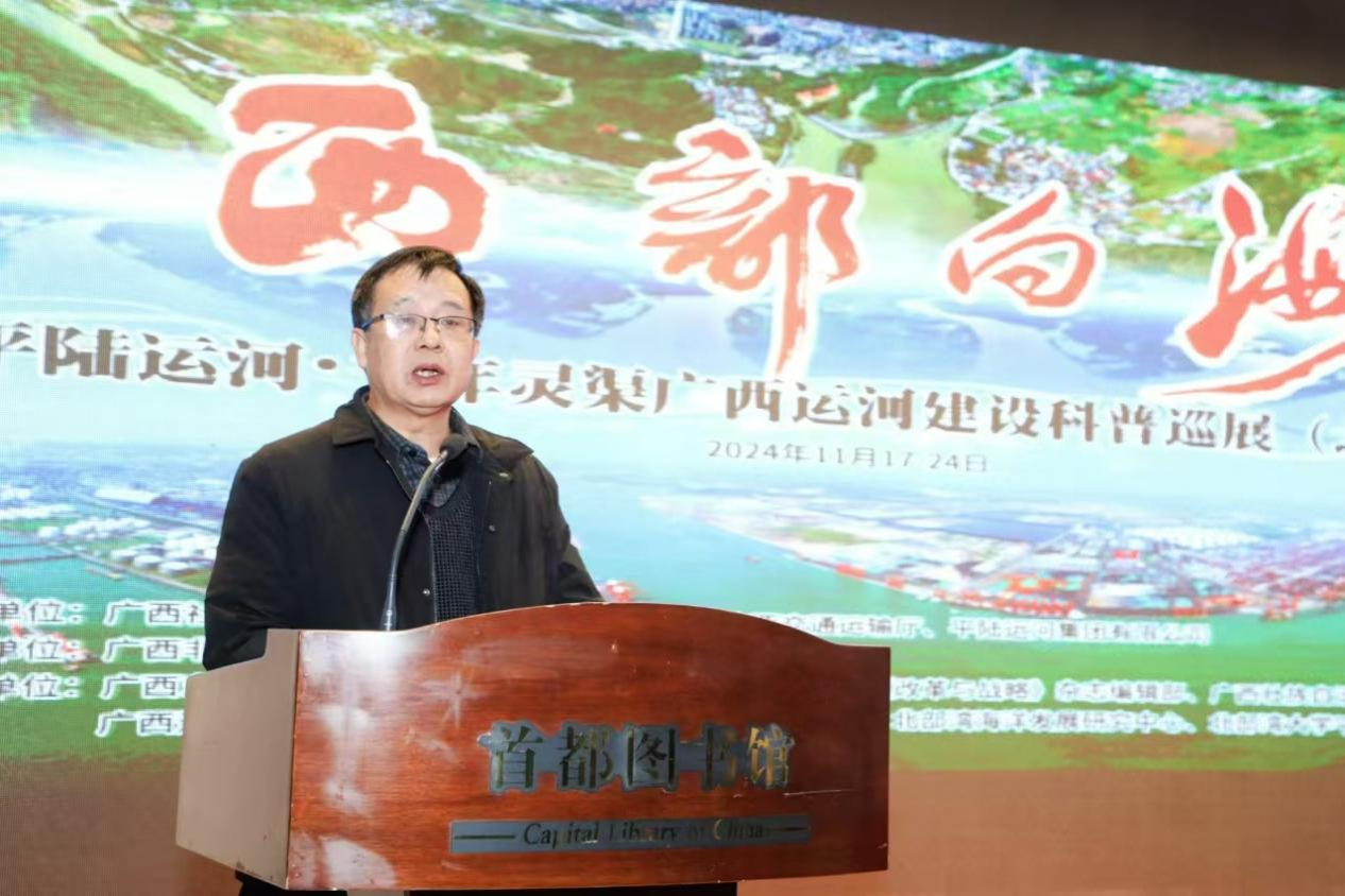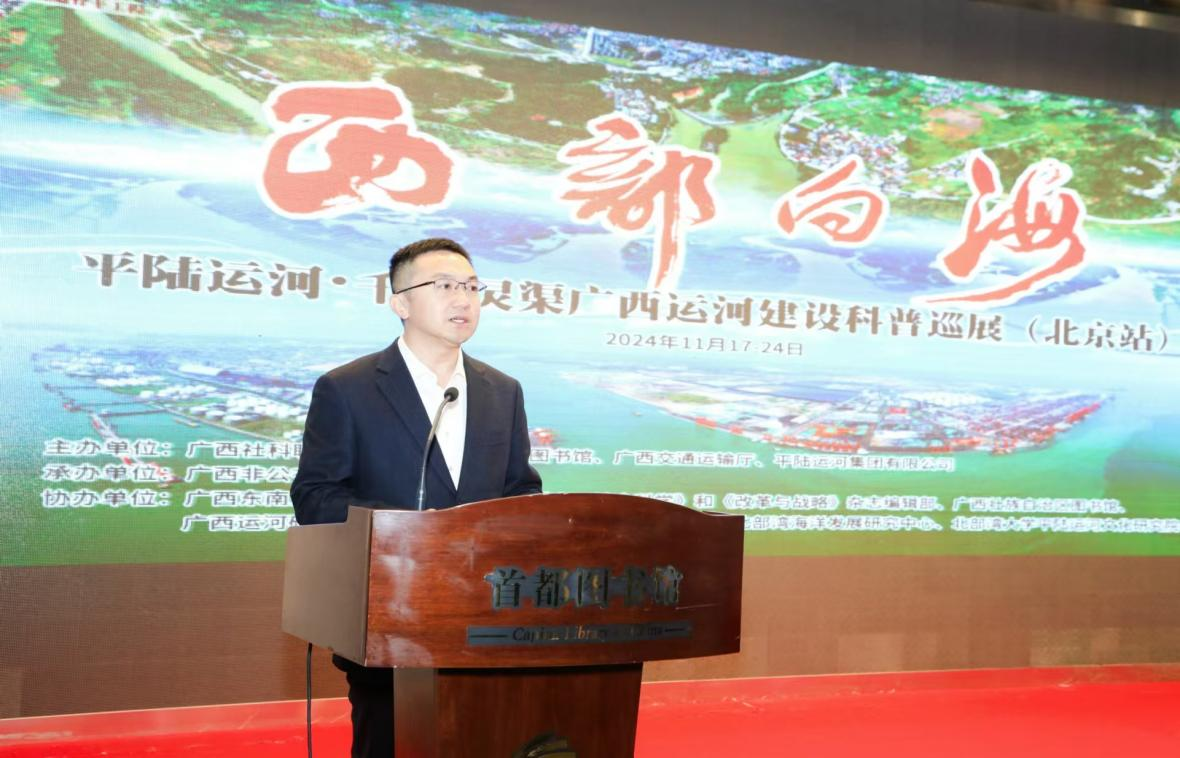 11月17日,由广西壮族自治区社会科学界联合会、广西壮族自治区人民政府驻北京办事处、首都图书馆、广西壮族自治区交通运输厅、平陆运河集团有限公司联合主办, 北部湾海洋发展研究中心(以下简称“中心”)、北部湾大学平陆运河文化研究院协办的“西部向海——平陆运河•千年灵渠广西运河建设科普巡展(北京站)”在首都图书馆开幕。自治区社科联副主席刘俊、中心研究员及校党委副书记陈磊、桂林旅游学院副校长李永强、首都图书馆副馆长张娟出席开幕式并致辞。